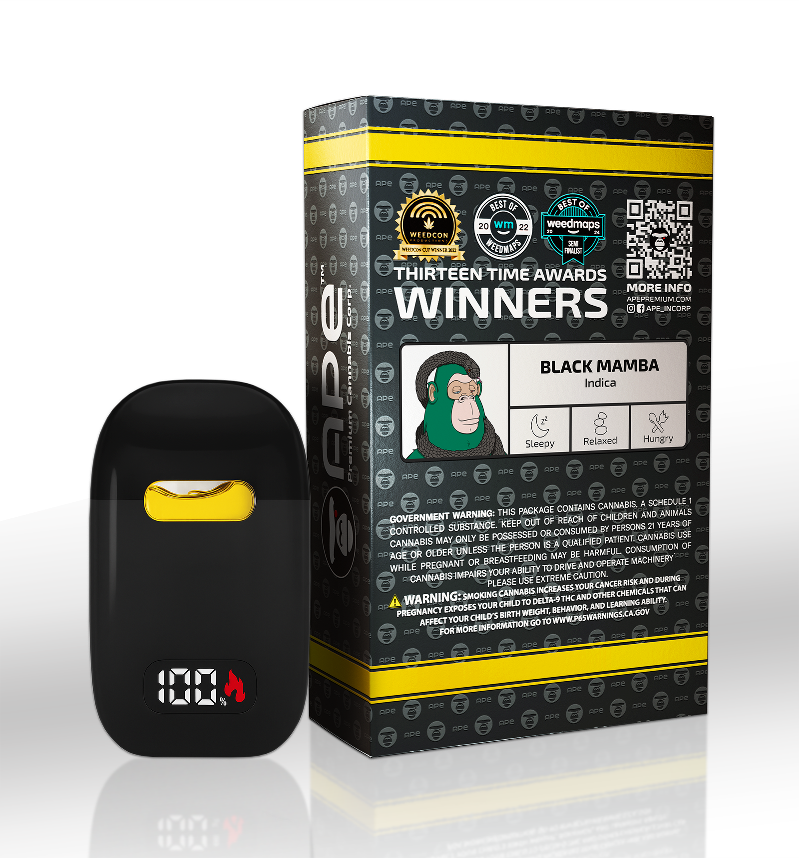 The Black Mamba – 2g Live Resin Disposable Vape | APE is designed for users who enjoy deep, relaxing cannabis experiences paired with bold flavor profiles. This disposable vape pen is filled with live resin, a premium concentrate made from freshly harvested cannabis that is flash-frozen to preserve its natural terpene profile and cannabinoid content. This results in a more aromatic, flavorful, and full-spectrum vaping experience.