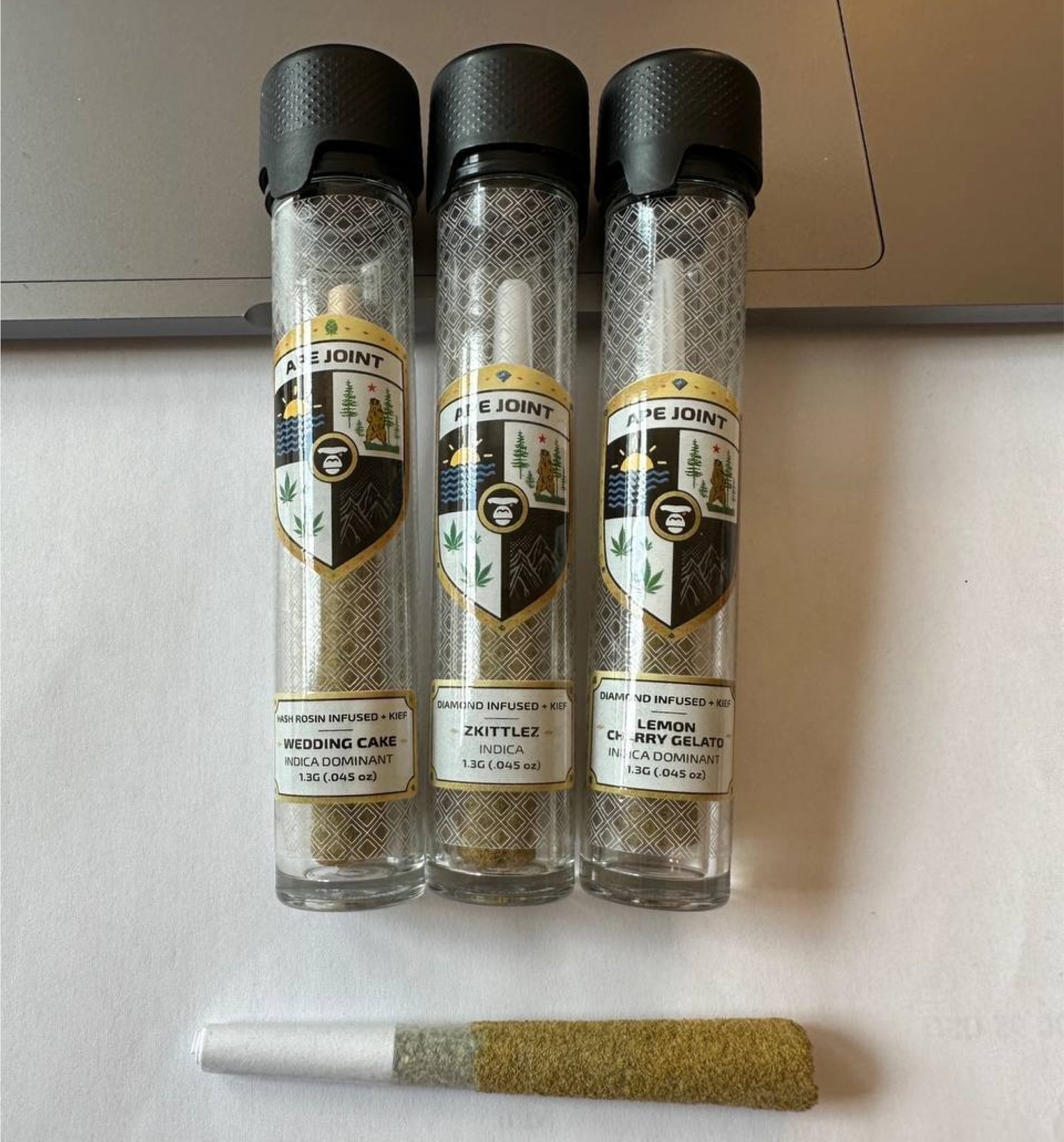 The Wedding Cake Joint Hash Rosin Infused + Kief – 1.3g | APE is crafted for users who want a premium and flavorful cannabis smoking experience. This pre-rolled joint is made with high-quality cannabis flower and enhanced with hash rosin and kief, creating a product with a richer terpene profile and more layered aroma compared to standard pre rolls.